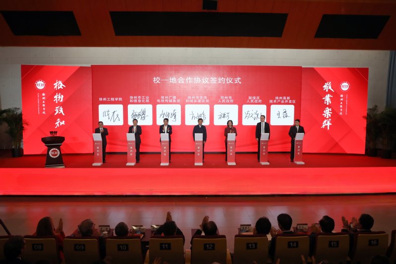 大会现场举行合作签约仪式。学校分别与徐州市工业和信息化局、徐州广播电视传媒集团、徐州市住房和城乡建设局、邳州市人民政府、鼓楼区人民政府、徐州高新技术产业开发区签订校地合作协议,与常州大学、中国矿业大学、南京工业大学、伊犁师范大学、新疆工程学院签订校校合作协议,与扬州职业技术大学、徐州工业职业技术学院、江苏财会职业学院、常州工程职业技术学院、江苏食品药品职业技术学院签订校校合作贯通式培养协议,与江苏黎明控股集团有限公司、徐州市盖力工程机械有限公司、江苏蓝丰生物化工股份有限公司、徐州吉安矿业科技有限公司、江苏华瑜变压器有限公司、江苏华旭环卫科技有限公司签订校企合作项目协议。协议的签订,既是对学校前期校地、校校、校企深度合作的延续,更是资源与智慧的深度融合新起点,为学校发展注入了新动能,为区域产业高质量发展提供了智力支撑。