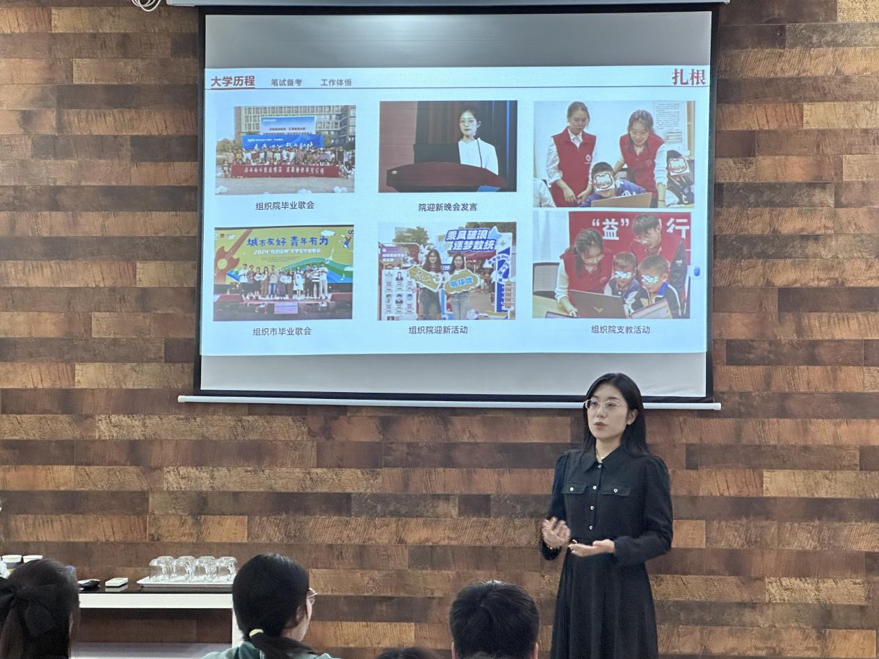 在友好的氛围中,王菲菲向同学们介绍,参与科研竞赛不仅能锻炼团队协作与解决问题的能力,也为日后求职面试积累了丰富素材。她以“三下乡”社会实践为例,讲述如何将走访村民、开展乡村调研等经历融入自我陈述,增强表达的感染力与说服力。她鼓励大家积极参与各类科研与实践项目,为个人成长积蓄“硬实力”。在志愿服务与学生工作方面,王菲菲分享了担任校自强社主席期间的体会。她表示,这些经历让她更加理解“服务与担当”的意义,也与她最终选择的基层工作方向高度契合。她建议同学们在实践中多观察、多思考,不断深化对社会的认知和对自我的定位。此外,王菲菲还介绍了她在时间管理、素材整理、面试礼仪等方面的具体做法,提醒大家面对长期目标时要做好规划、稳住心态,既要坚定方向,也要避免焦虑。