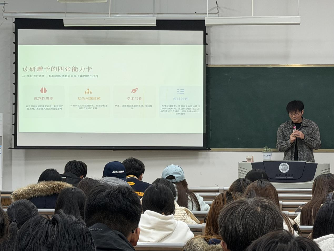 为搭建考研学子交流平台,深化“我和学校共成长”育人理念,充分发挥一站式社区服务效能,学工处联合管理工程学院于2025年11月7日下午在求真楼104成功举办考研经验交流会。本次活动面向25信管、25大数据学生,特别邀请2021级校友时艺桐返校分享。