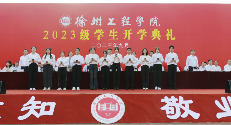 典礼上,校领导为新生代表佩戴校徽,颁发学生证。别在胸前的校徽熠熠生辉,它既凝结着“格物致知,敬业乐群”的精神品格,又承载着一代代“新徐工院人”的使命担当。